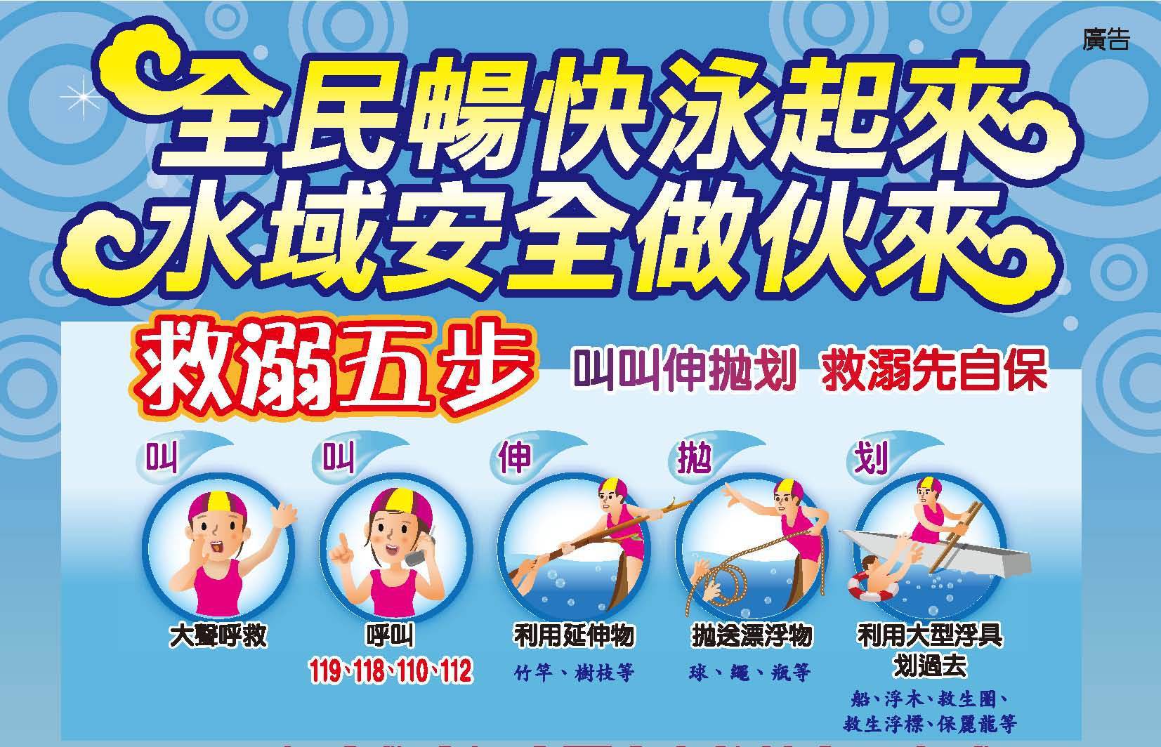 6.如發現有人溺水,應大聲呼叫請求支援,並打118、119向海巡單位或消防單位求援,切勿自行冒然下水施救;並察看周圍是否有救生繩、救生圈等具有浮力之物品,作為岸上施救的救生器材。